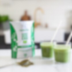 - Greensblandning med superfood som spannmålsgräs, alger, grönsaker och bär
