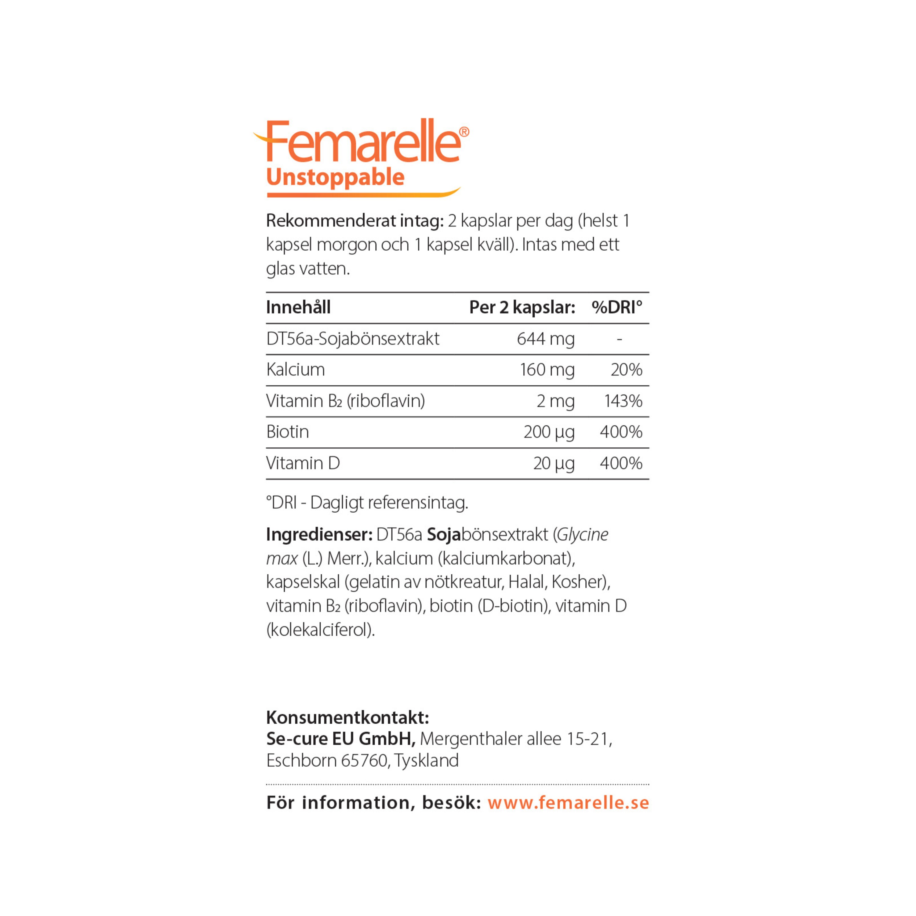 Femarelle Unstoppable innehåller kalcium, som är bra för skelettet. Tack vare innehållet av DT56a kan dock mängden kalcium hållas nere och överskott undviks på så vis.