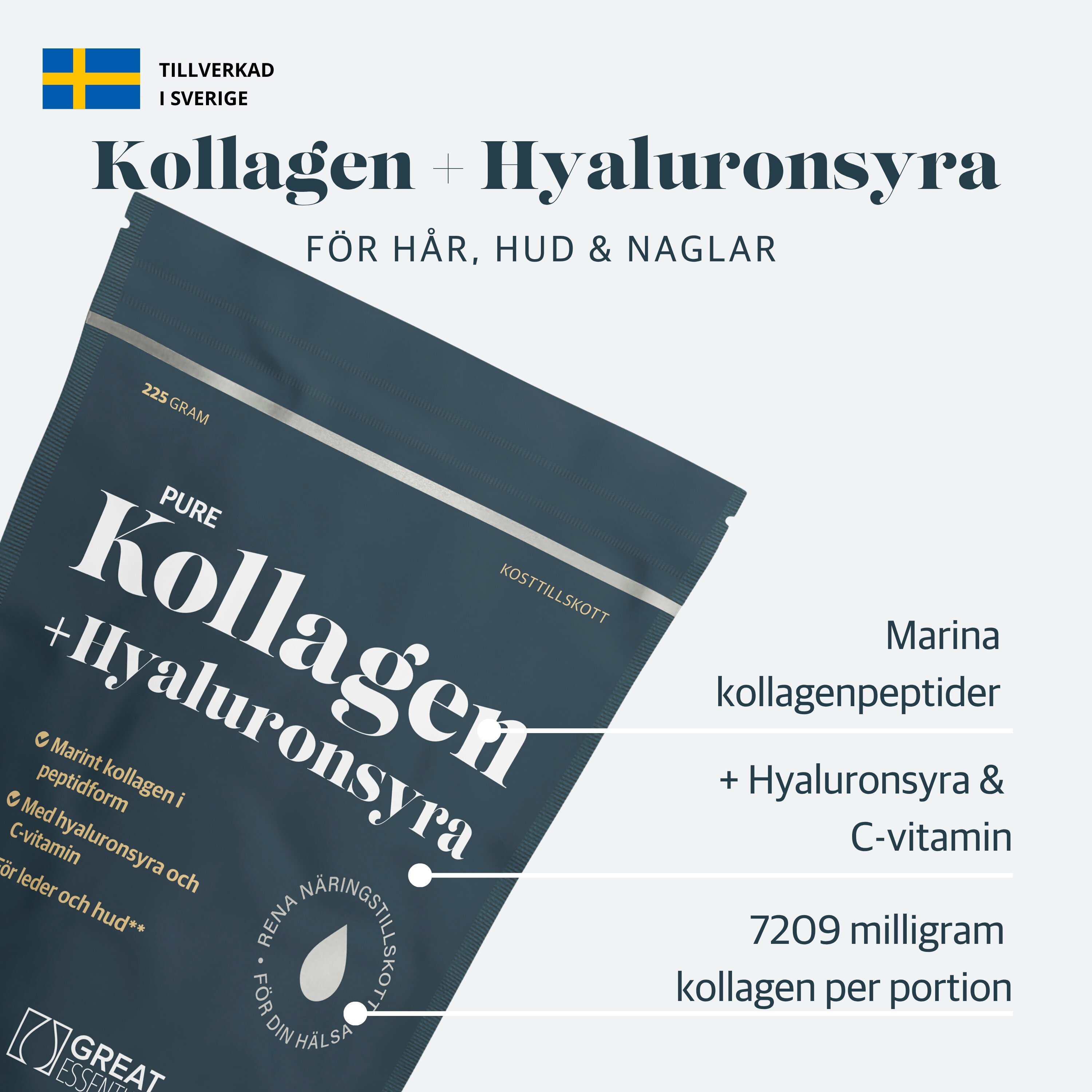 - Hydrolyserade marina kollagenpeptider + hyaluronsyra
