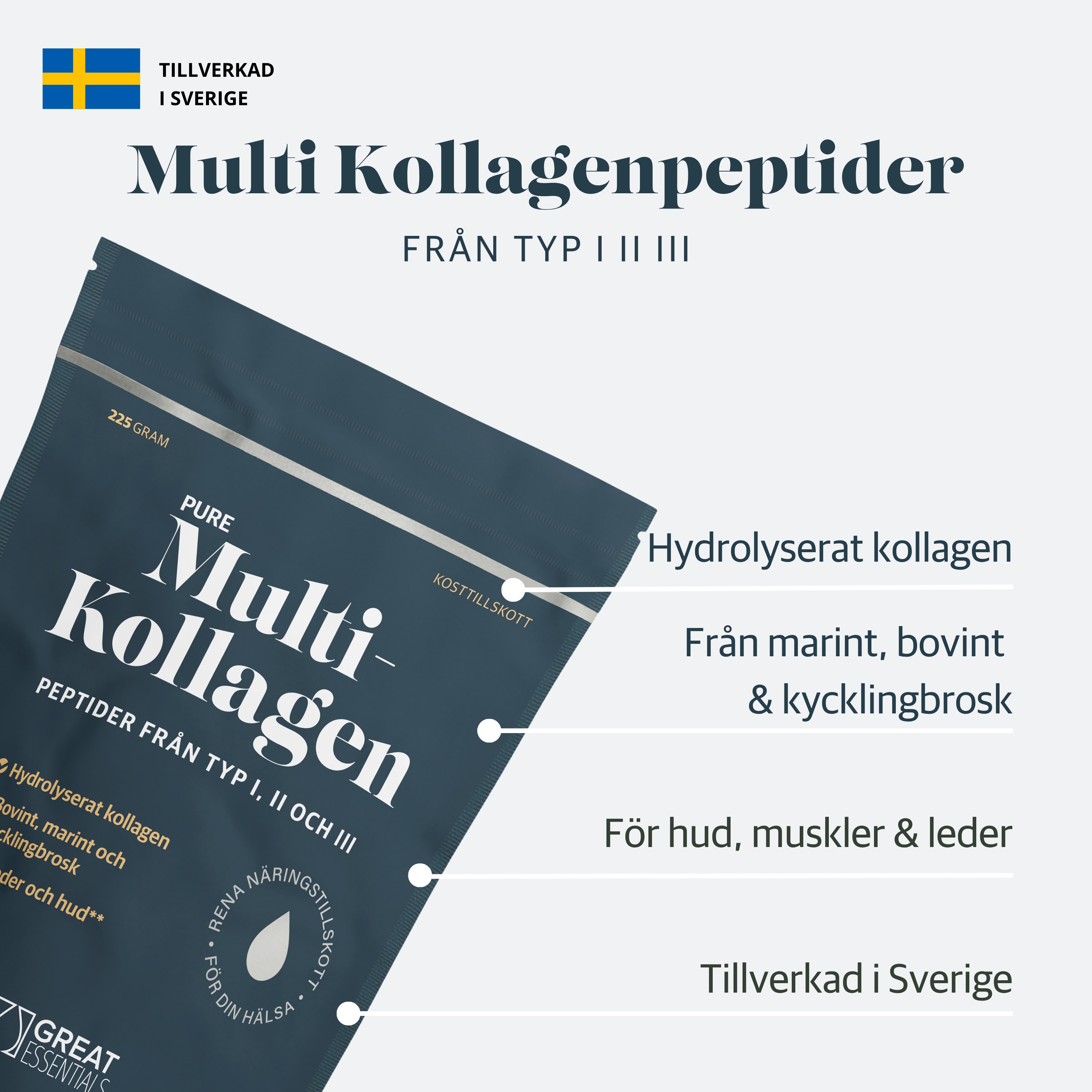 Pure Multi Kollagenpeptider från Great Essentials innehåller peptider från kollagen typ I, II och III med ursprung från nötkreatur, fisk och kyckling. Peptidform innebär att kollagenet är hydrolyserat och nedbrutet till kortare aminosyrasträngar för bättre upptag och effekt. Detta gör att produkten får en bredare aminosyraprofil och framför allt är bra för muskler och leder.