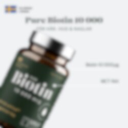 Pure Biotin 10000 är en extra stark biotin som innehåller 10.000 mikrogram biotin per kapsel. Biotin är essentiellt för hår, hud och naglar. Biotin bidrar även till en normal energiomsättning då det deltar i nedbrytningen av fett och kolhydrater. Innehållet är designat för optimalt upptag och effekt.