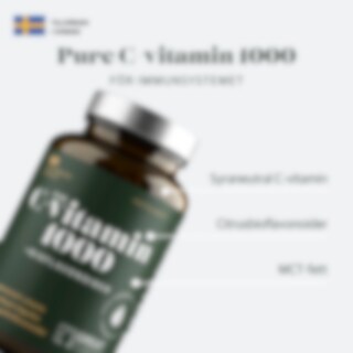 Pure C-vitamin 1000 är en extra stark C-vitamin som innehåller 1000 milligram, per dagsdos, syraneutralt C-vitamin tillsammans med bioflavonoider från pomeransextrakt. Kompositionen är framställd för optimalt upptag och effekt, därför används ett syraneutralt kalciumaskorbat.