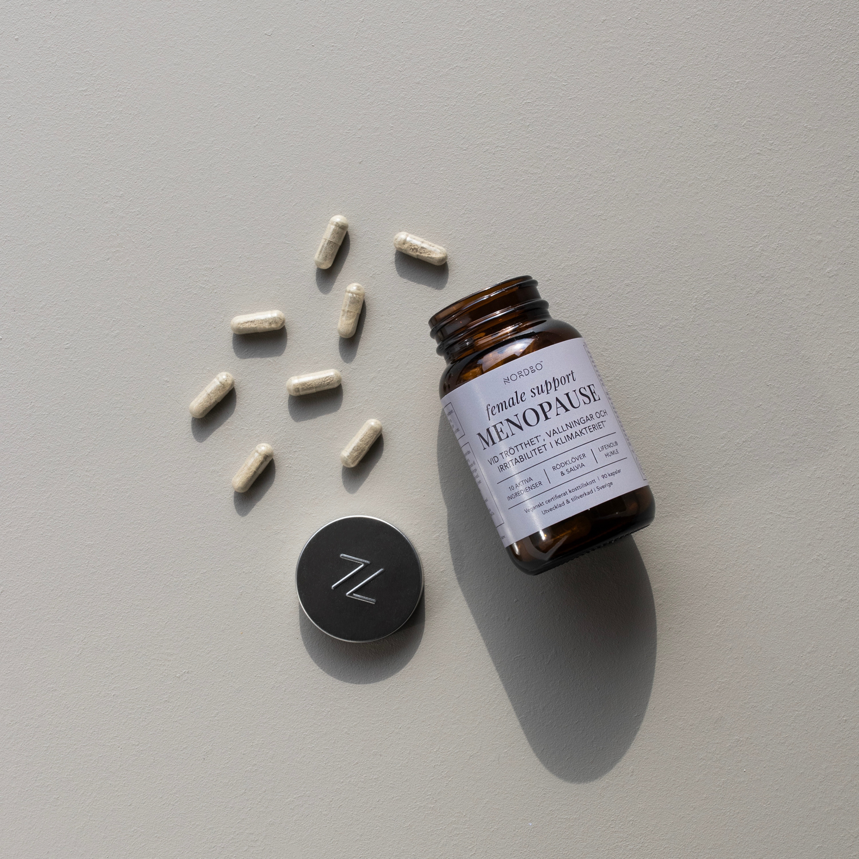 NORDBO Female Support Menopause är veganskt certifierad av Djurens Rätt. Burken är tillverkad av glas och locket av metall. Glas och metall kan återvinnas oändligt och ger ett fullständigt skydd mot fukt och luft.