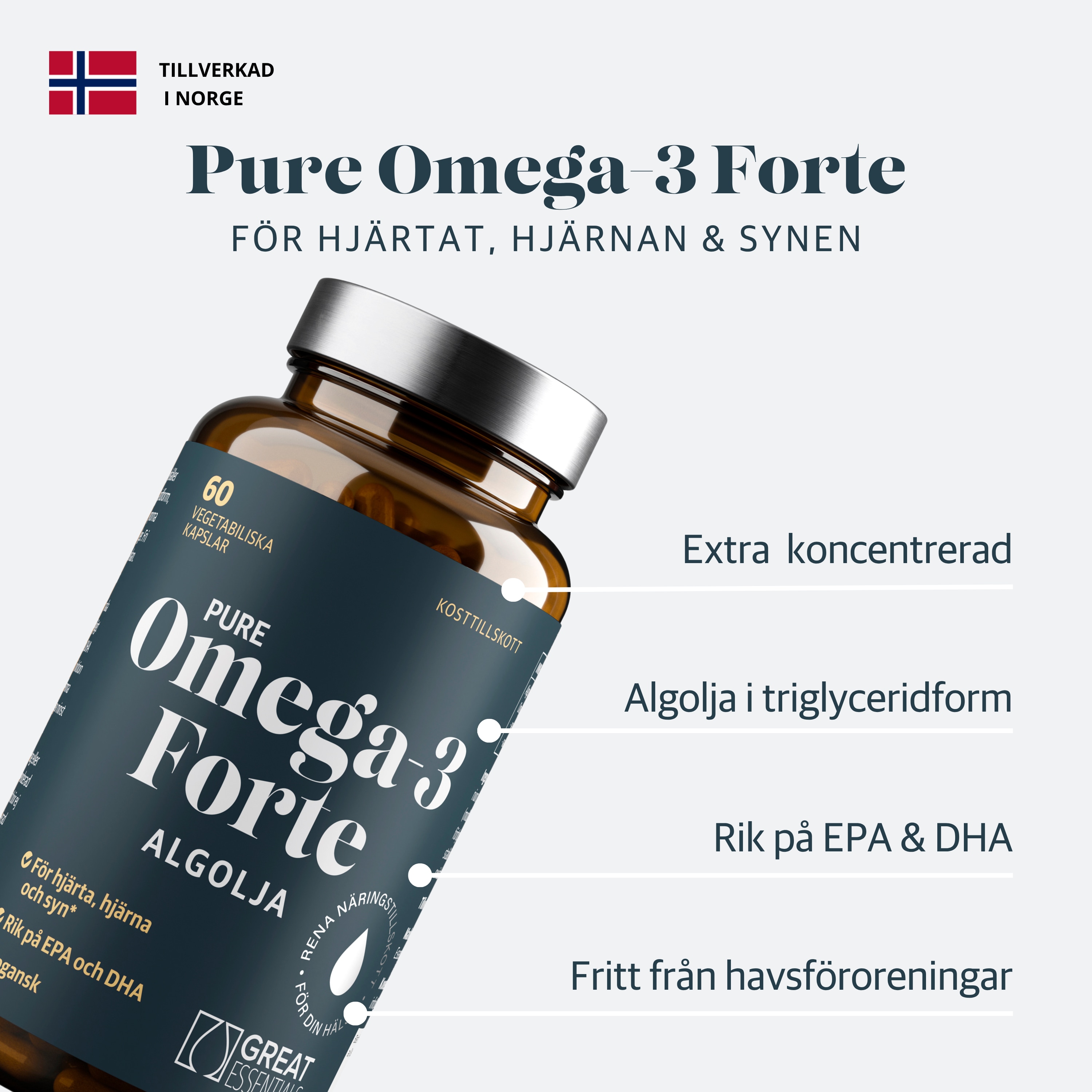 Pure Omega-3 Algolja från Great Essentials produceras med fokus på hållbarhet och renhet. Mikroalgerna odlas i slutna och kontrollerade miljöer i Norge, vilket säkerställer en jämn fettsyresammansättning och minimerar risken för föroreningar som tungmetaller och miljögifter.