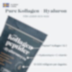 Pure Kollagenpeptider + Hyaluronsyra innehåller Peptan-kollagen som är ett hydrolyserat kollagen i peptidform, vilket innebär att kollagenet är nedbrutet till kortare aminosyrasträngar (2000 dalton) för bättre upptag och effekt tillsammans med hyaluronsyra och vitamin C.