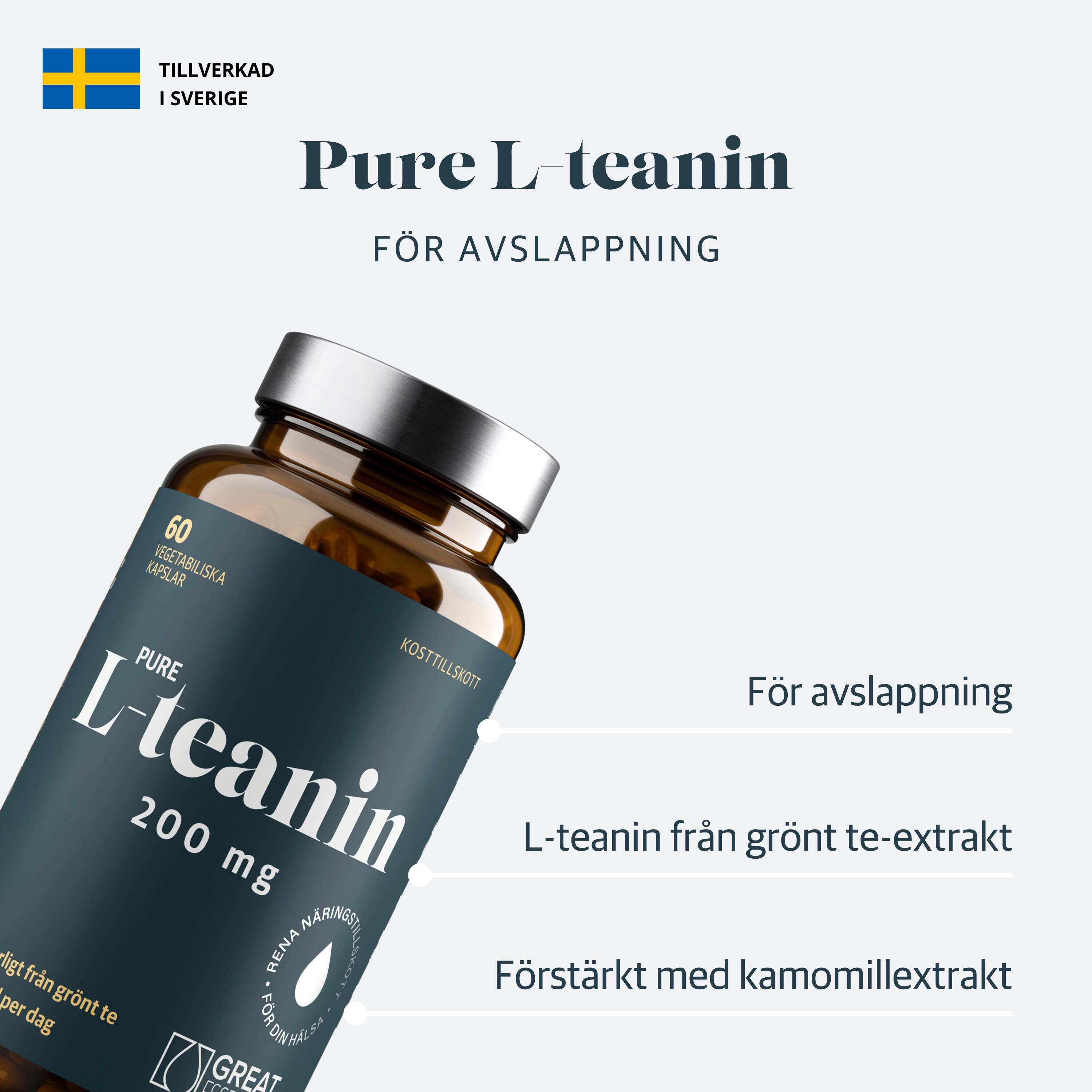 Pure L-teanin från Great Essentials innehåller 200 milligram naturligt L-teanin från grönt te-extrakt. L-teanin har en traditionell användning för att främja avslappning.