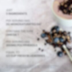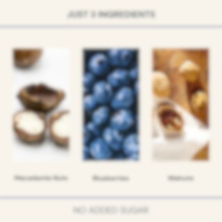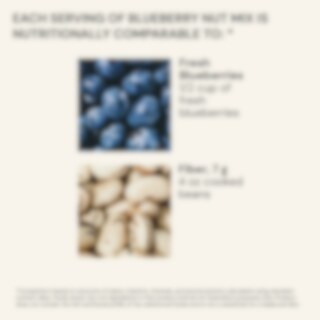 Blueberry Nut Mix består av verkliga blåbär, makadamianötter och valnötter, med cirka 170 mg polyfenoler per portion, för att ge ett starkt antioxidativt tillskott. Denna blandning är utformad för att fungera som ett näringsrikt mellanmål, topping på havregryn eller ingrediens i hälsodrycker.