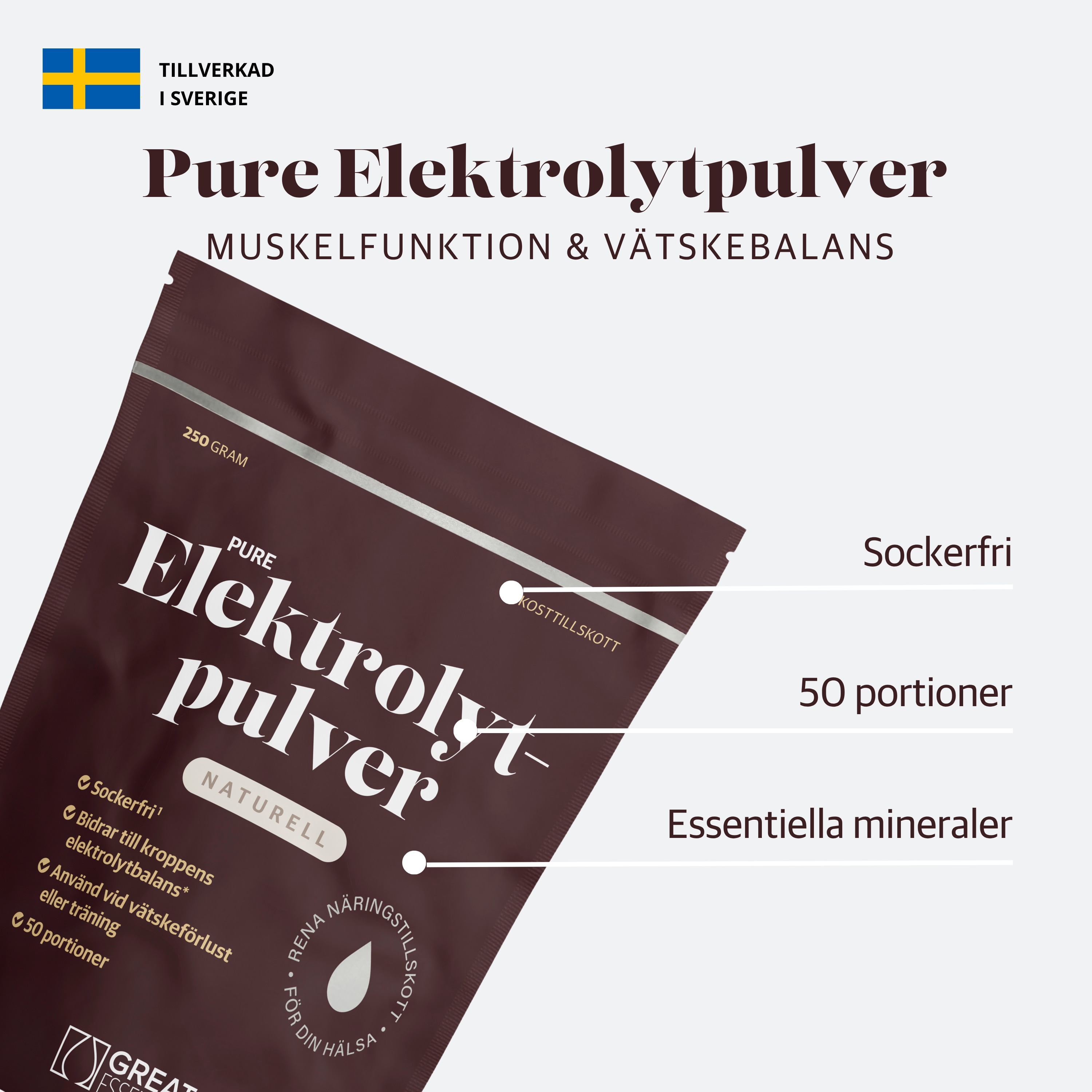 Pure Elektrolyter är ett sockerfritt elektrolytpulver med essentiella mineraler tillsammans med Le Guérande-havssalt och kokosvattenpulver för att återställa en sund vätskebalans. Innehållet är designat för optimalt upptag och effekt. Naturell smak, blanda och smaksätt som du önskar.