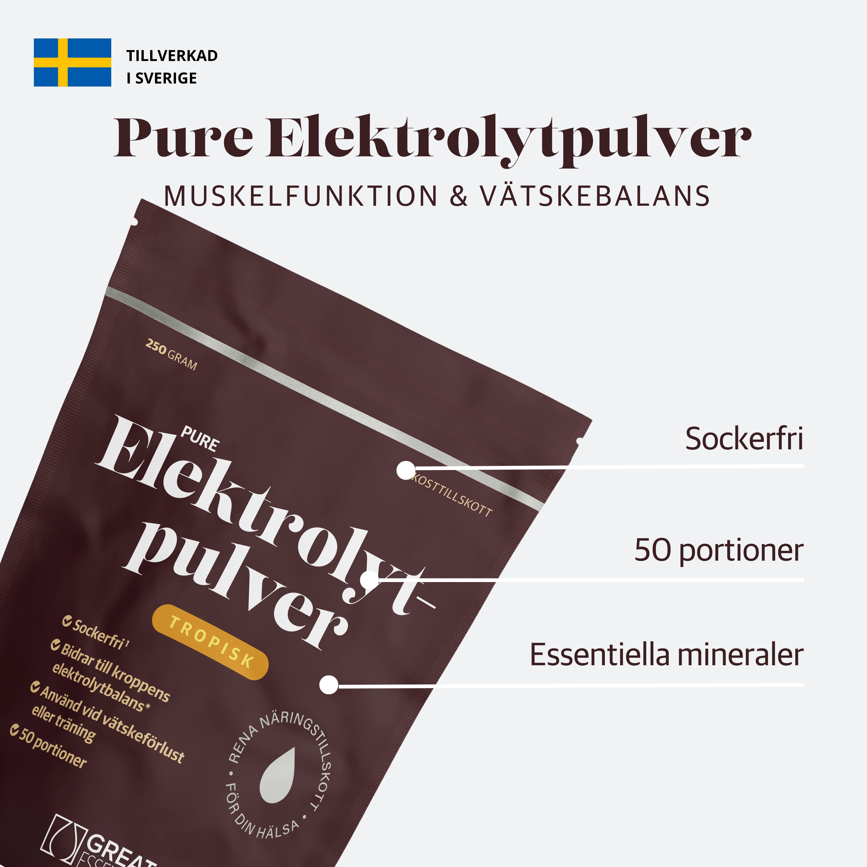 Pure Elektrolyter är ett sockerfritt elektrolytpulver med essentiella mineraler tillsammans med Le Guérande-havssalt och kokosvattenpulver för att återställa en sund vätskebalans. Innehållet är designat för optimalt upptag och effekt, därför är den smaksatt med 100 % naturligt ananas- & passionfruktspulver.