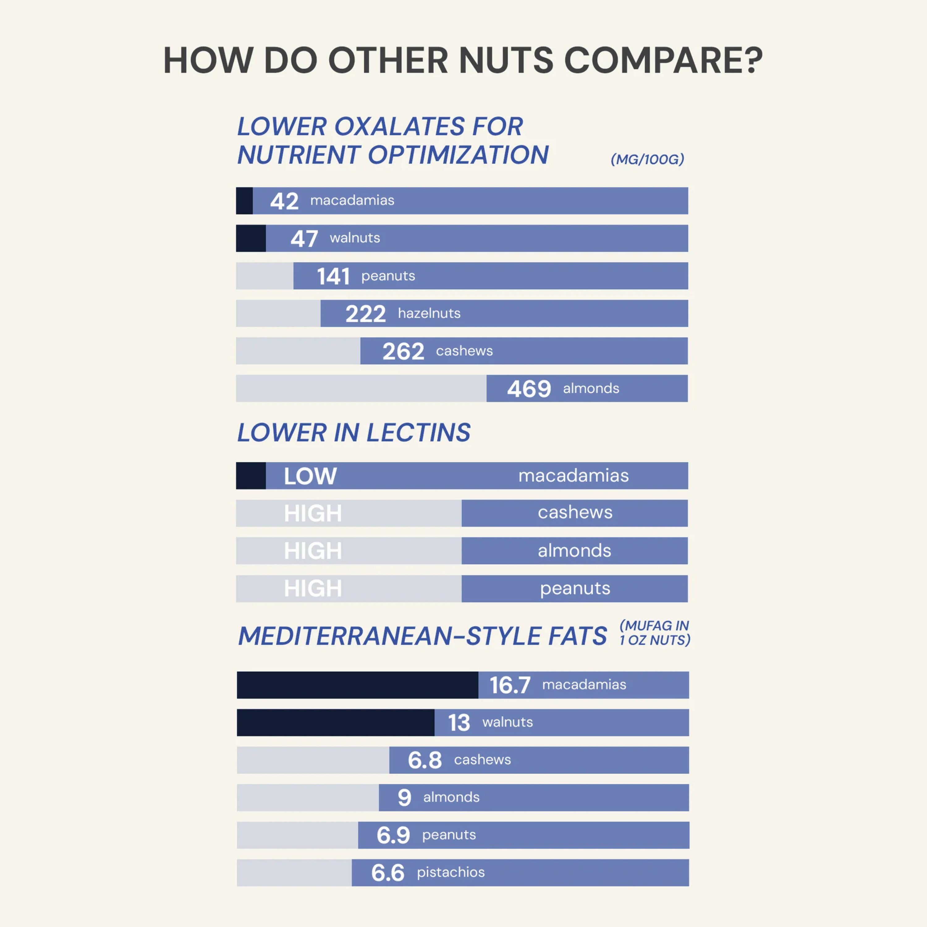 Blueberry Nut Mix består av verkliga blåbär, makadamianötter och valnötter, med cirka 170 mg polyfenoler per portion, för att ge ett starkt antioxidativt tillskott. Denna blandning är utformad för att fungera som ett näringsrikt mellanmål, topping på havregryn eller ingrediens i hälsodrycker.