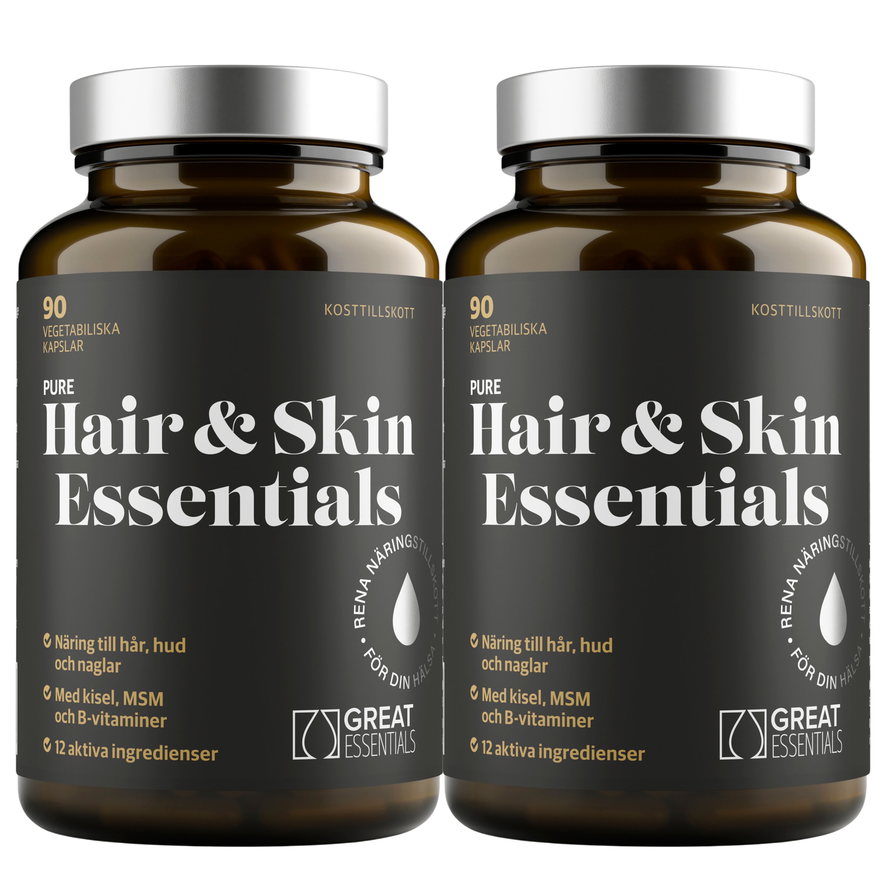 Pure Hair & Skin Essentials från Great Essentials är ett komplett skönhetskomplex, inifrån, utvecklat för dig som vill stärka hår, ge huden lyster och främja hållbara naglar. Produkten innehåller 12 noggrant utvalda näringsämnen – växtextrakt, aminosyror, mineraler och vitaminer – som tillsammans stödjer kroppens egna processer för hår, hud och naglar.