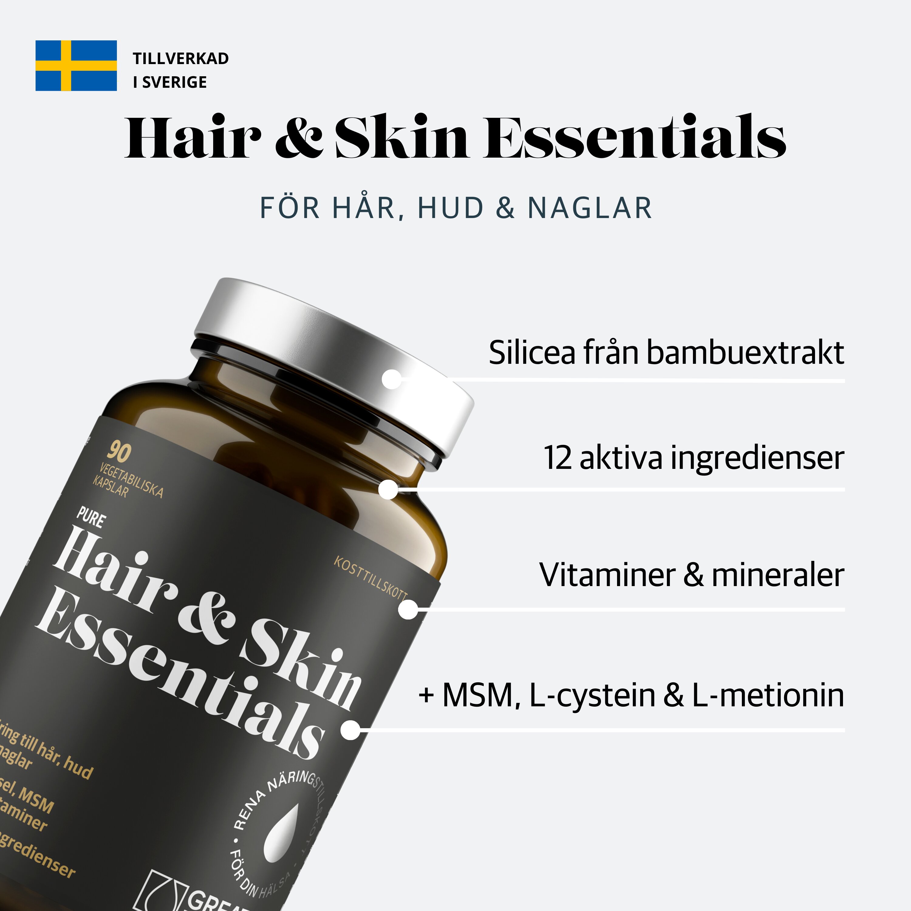 Pure Hair & Skin Essentials från Great Essentials innehåller bambuextrakt (70 % kisel) som ger en hög koncentration av kisel – en naturlig byggsten i hår, hud och naglar. Formulan är förstärkt med MSM, L-cystein och L-metionin, tre komponenter som ingår i keratinets struktur.