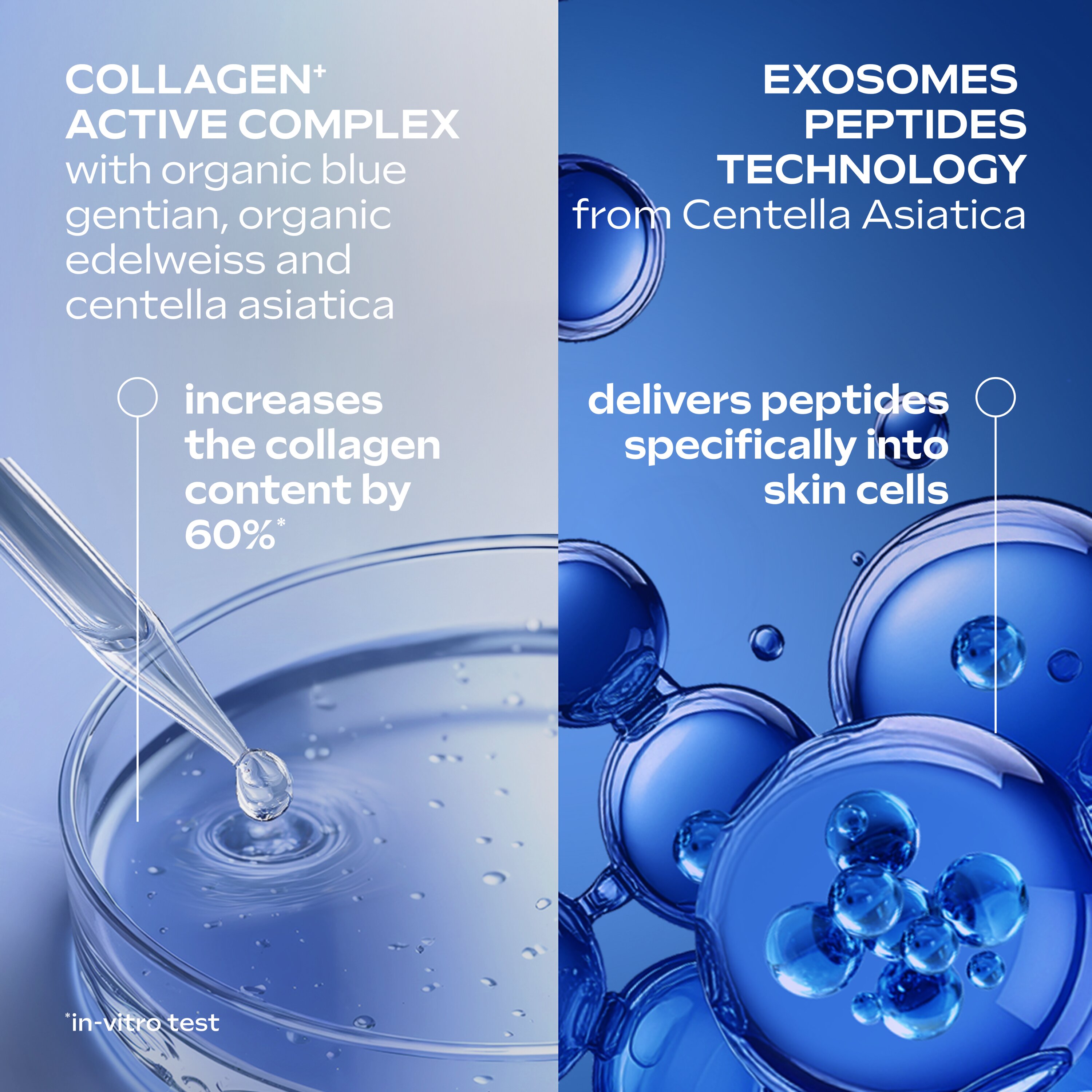 Collagen+ Active Complex består av ekologisk blå gentiana, ekologisk edelweiss och centella asiatica. Exosomes Peptides-teknologin innehåller växtbaserade exosomer från Centella Asiatica, som fungerar som avancerade bärare av aktiva ingredienser. Dessa exosomer levererar peptider direkt till hudcellerna och motverkar ålderstecken.