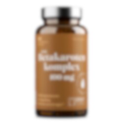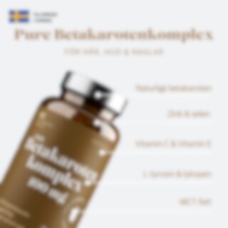 Pure Betakarotenkomplex innehåller 100 milligram naturligt betakaroten per kapsel tillsammans med flera synergistiska vitaminer och mineraler, bland annat l-tyrosin och zink som bidrar till normalt hår, hud och naglar.