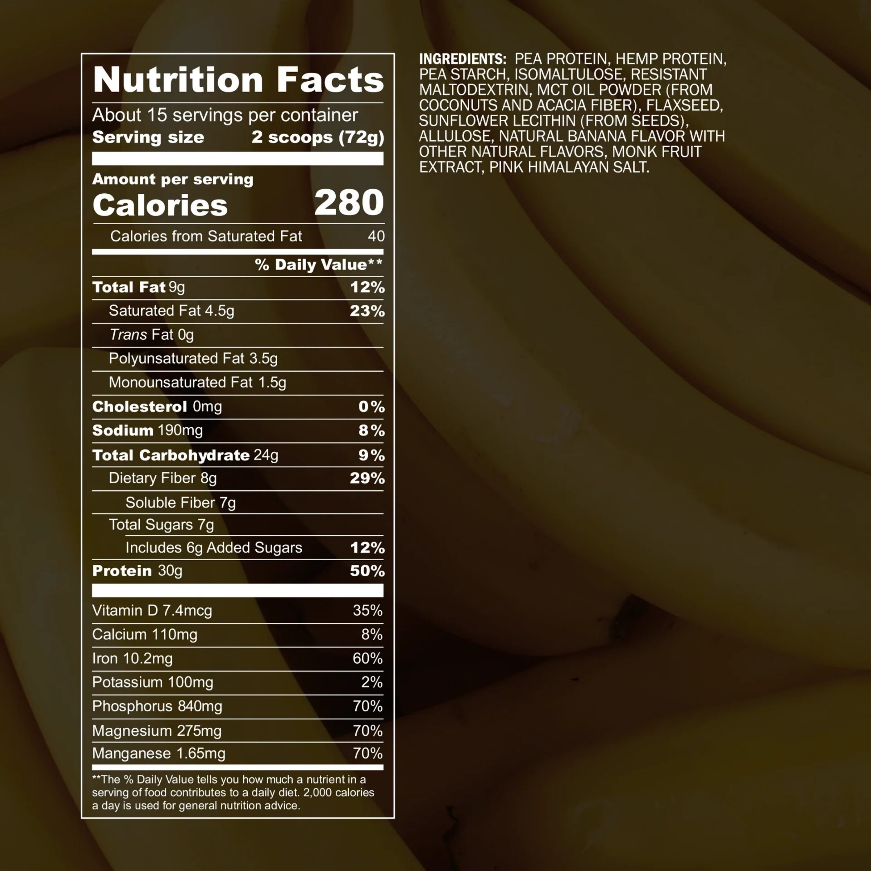 Detta banansmakade proteinpulver är utformat för att ge en balanserad profil av makro- och mikronutrienter som stöd för ämnesomsättning, muskelunderhåll och långvarig energi. Formulan optimeras för att erbjuda en kontrollerad frisättning och minska blodsockerspikar. Som med alla BLUEPRINT-produkter genomgår denna sats tredjepartstestning, och COA-rapporter publiceras öppet. Den är fri från överflödiga fyllmedel och använder lättabsorberade proteinkällor. Pulvret passar att användas som måltidsersättning eller post-workout, och den balanserade näringssammansättningen gör att det kan integreras i ett dagligt hälsoprogram. Smaken är noggrant kalibrerad för att vara behaglig utan att kompromissa med funktion.