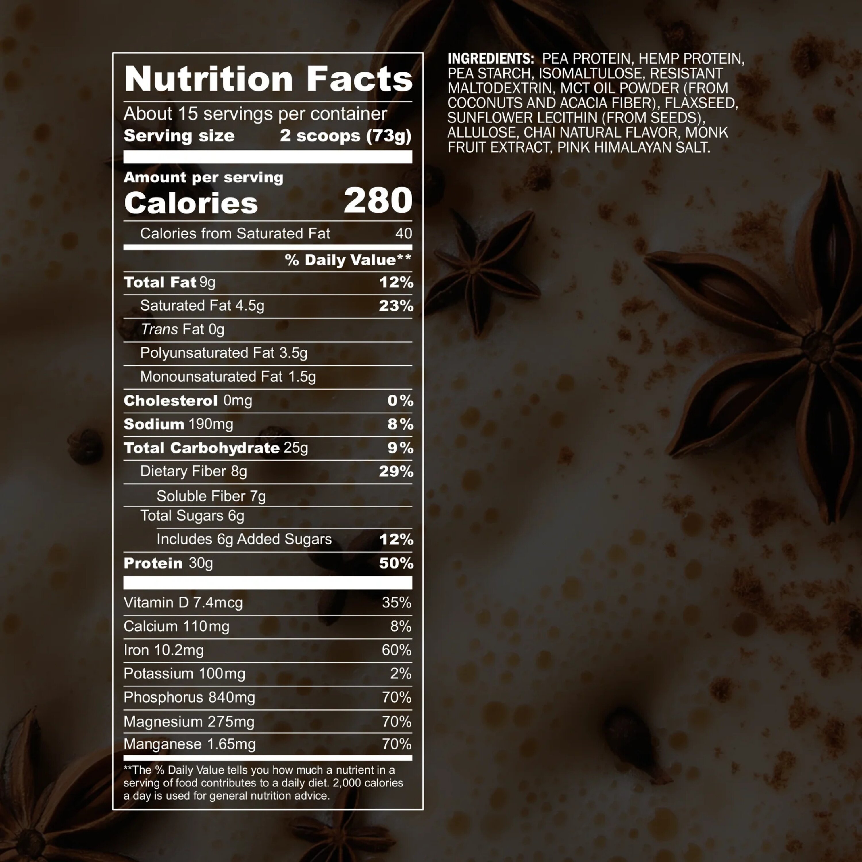 Detta chai-smakade proteinpulver är utformat för att erbjuda både funktion och njutning — med kryddiga chai-toner som kompletterar en balanserad nutritionsprofil. Produkten kombinerar högkvalitativt protein med stabila kolhydrater och adaptiva mikronutrienter för att stödja ämnesomsättning och uthållighet.