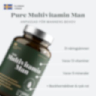 Pure Multivitamin Man är ett komplett näringstillskott med vitaminer, mineraler och växtextrakt anpassat för mannens behov. Innehållet är designat för optimalt upptag och effekt.