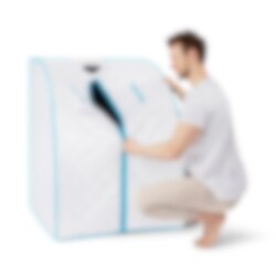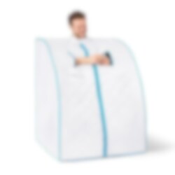 Bastun blir 65 grader varm inom 10 minuter, väger endast 5,5 kg och monteras på en minut. Du sitter på en medföljande stol, har huvudet utanför och andas frisk luft. Efter användning kan den infraröda bastun lätt packas ihop plant och stuvas undan. Det enda du behöver är ett eluttag. Stolen som medföljer är en fällstol, sitthöjden är 40cm och ryggstödet är 66cm. Om man vill går det bra att använda en annan stol istället för den som medföljer.