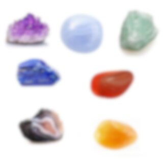 Kristaller: Ametist, Lapis lazuli, Blå spetsagat, Grön Aventurin, Gul agat, Gul aventurin, Röd agat.